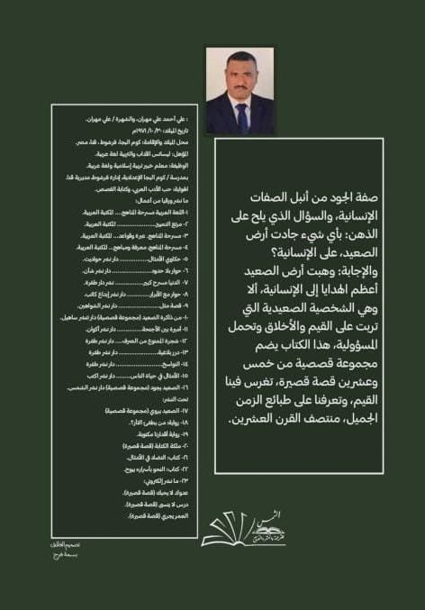 أرض الصعيد قطعة غالية من أرض مصر، أرض تجود بالعطاء دائما، أهلها يحبون الاستقرار، لا يرغبون في الهجرة إلا عند الضرورة، ومع ذلك فهم دائما متعلقون بمقر الميلاد والنشأة، بنوا الحضارة التي شهد لها العالم بالإبداع والرقي، وإن كانت المعيشة على أرضها صعبة إلا أن أهلها تربوا على مواجهة الصعاب، فمن المعطيات القليلة المتاحة، استطاعوا أن يقهروا المتاعب، وأن يذللوا الصعاب، هلم نتقابل مع أرض هذه الأرض ونسمع تجاربهم التي مروا بها.. هذه المجموعة القصصية تتكون من خمس وعشرين قصة، تدور أحداثها في منتصف القرن العشرين، تحكي لنا هذه القصص عن صعوبة المعيشة، وكيف واجهها الصعيدي بعزيمة قوية، من الخلال المجموعة القصصية نقترب أكثر من عادات وتقاليد أهل هذه الأرض، كذلك نتعلم الدروس المستفادة من الحكايات الواقعية، فالتاريخ يعيد نفسه بشخصيات مختلفة، وبأماكن متباينة وبشخصيات متنوعة، والمكسب الحقيقي من وراء تلك القصص، هو الاستفادة من قصص السابقين.
