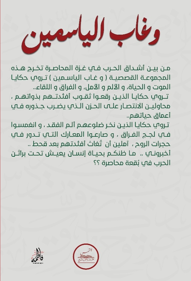 من بين أشتاتِ الحربِ في غزة المحاصرة تخرج هذه المجموعة القصصية ( و غاب الياسمين ) تروي حكايا الموت و الحياة، و الألم و الأمل، و الفراق و اللقاء..
